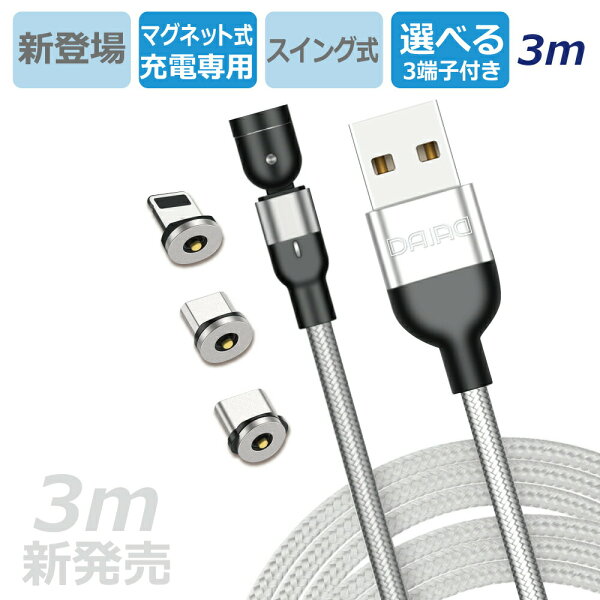 【互換性・非対応・保証内容・注意事項】 ※トラブル防止のため、商品説明を確認しましょう! 商 品 説 明 商品名 マグネット式 充電ケーブル スイング式 3メートル 充電専用 ブランド/品番 DAIAD / SWC-3M カラー ブラック・シルバー・レッド・パープル ケーブル長 3メートル (コネクタ部分含む) 充電電流 最大約1.5A セット内容 マグネットUSB充電ケーブル×1 microUSBコネクタ×1 Type-Cコネクタ×1 Lightningコネクタ×1 対応機種 Lightning互換: iPhone13/iPhone12/iPhone12Pro/iPhone12mini/iPhoneSE iPhone11,iPhone XS,iPhone XR,iPhone X,iPhone 8Plus, iPhone 8,iPhone 7 Plus,iPhone 7, iPhone SE,iPhone 6s Plus, iPhone 6s,iPhone 6Plus,iPhone 6,iPhone 5s, iPhone 5c, iPhone 5,iPad Pro,iPad Air,iPad mini,iPod touch,AirPods APPLE Pencil....etc Type-C: SONYヘッドホン Boseヘッドホン,任天堂スイッチ,iQos,GoPro8, SAMSUNG Galaxy,SONY Xpreia,SHARP Aqous,HUAWEI, 富士通 arrows,京セラ,ZTE,ASUS,ZenFone,LG,HTC....etc MicroUSB: PlayStationコントローラー,PSVITA,加熱式タバコglo, モバイルwifiルーター,BlueTooth機器,VRゴーグル,Oculusgo,GoPro, ドライブレコーダー、ワイヤレスイヤホン,パワーバンク, MicroUSBの持つAndoroidスマホやタブレット端末....etc 非対応 例:MacBookのような高入力(1.5A)以上の端末では充電できません。