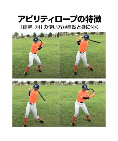 ■アビリティロープ アビリティロープは、投手の投げたボールに対して、アジャストさせ、ジャストミートに導く身体の使い方の修得を目標として開発しております 1.「しなり」を体感できる 2.「両腕・肘」の使い方が自然と身につく 3.基本的な要素を習得できる 「レベルスイング」「回転軸」 アビリティロープの名称は、合同会社キンビシャスの登録商標です。